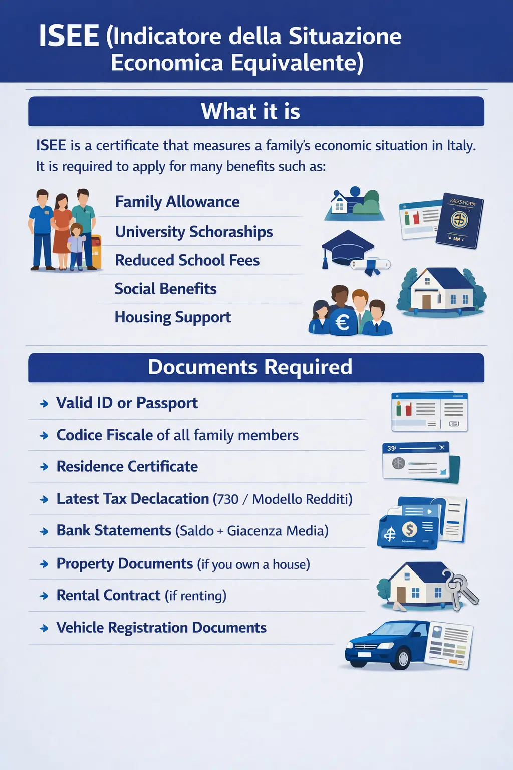ISEE is a certificate that measures a family’s economic situation in Italy. It is required to apply for many benefits such as family allowance, university scholarships, reduced school fees, social benefits, and housing support.